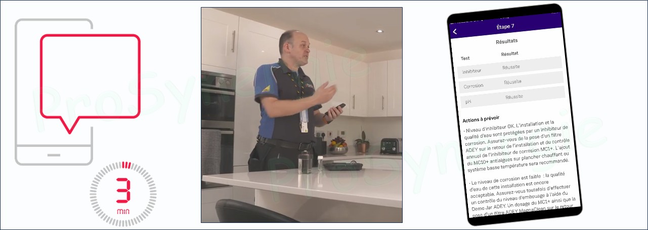 ADEY ProCheck® est le premier système d'analyse instantané et universel de la qualité de l'eau du chauffage central. Les résultats de qualité laboratoire sont fournis immédiatement et à distance à l’aide d’un smartphone. Le technicien pourra fournir au client une liste de recommandations personnalisées.