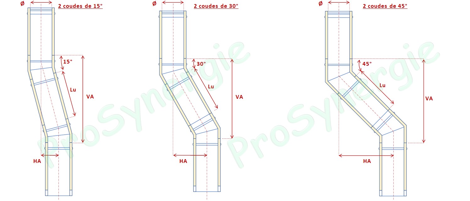 Vous trouverez ici les cotes pour les dévoiements avec deux coudes à 15, 30 ou 45° :