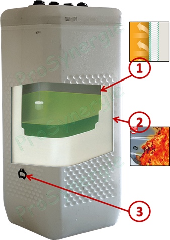 - Figure 3 n° (rep. 2) : Résistance au feu incluse Notre cuve “Intégrale” a fait l’objet de tests de tenue au feu dont elle détient le certificat (MPa Erwitte). De ce fait, elle peut être installée à 1 mètre de la chaudière.