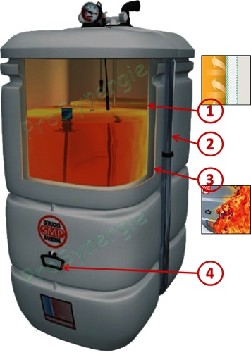 • Figure 3 n° (rep. 3) : Résistance au feu incluse Notre cuve “Intégrale” a fait l’objet de tests de tenue au feu dont elle détient le certificat (MPa Erwitte). De ce fait, elle peut être installée à 1 mètre de la chaudière.