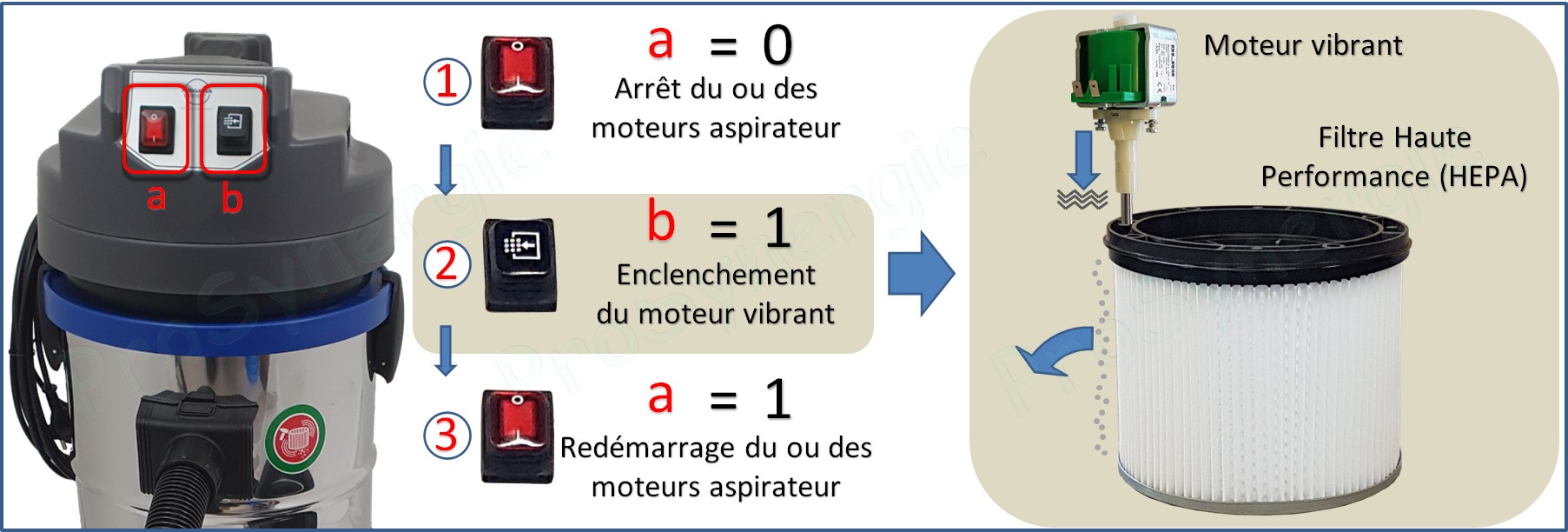 Les aspirateurs de ramonage Neso nouvelle gamme, pour la plupart, sont dotés d’un système de décolmatage électrique par moteur vibrant pour le nettoyage rapide et efficace du filtre. Le moteur vibrant est muni d'un axe en appui sur le support du filtre. Par ces vibrations les particules se dégagent du filtre et tombent dans la cuve.