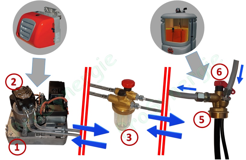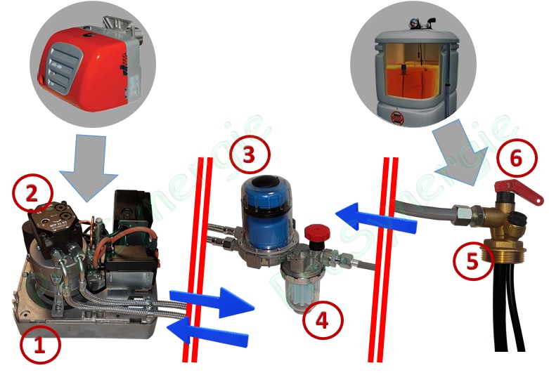 Liaison Brûleur, Filtre et Cuve Fioul (Mono-Tube ou Bi-Tube) et branchement des accessoires sur la Cuve