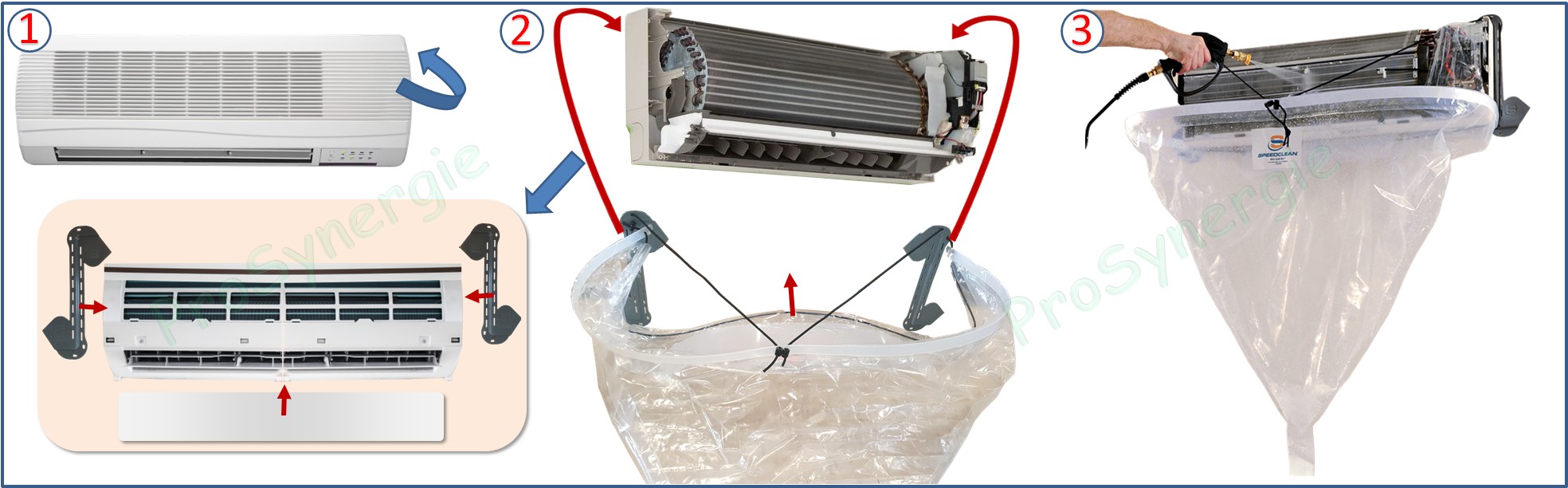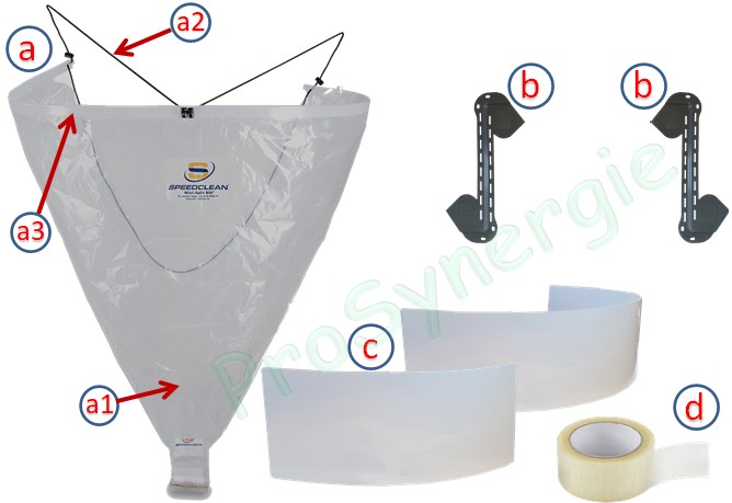 a : Bâche plastique pour réceptionner l'eau et les résidus du nettoyage. a1 : Bâche en plastique en entonnoir a2 : Cordon réglable élastique a3 : Règlette de maintien de la bâche à l'avant b : Fixations à coincer derrière le Split sur lesquelles sont attachés le cordon a2 et la règlette a3. c : Plaque de maintien de la bâche à coincer sous le split afin d'assurer son plaquage contre le mur. |