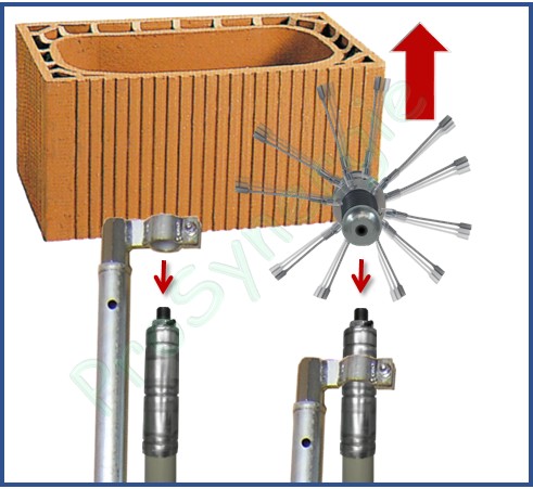 Après avoir été dévissée la boulle de la tête du Rotonet Roue, peut être remplacée par une Manille avec roulement, afin de guider la tête par le haut du conduit au moyen d’une corde ou de cannes de ramonage.