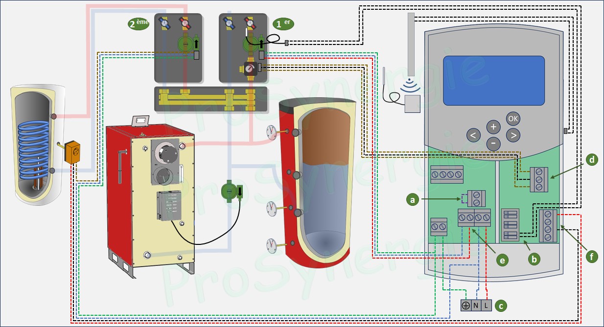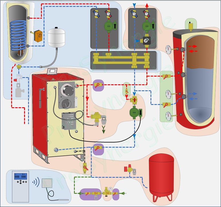 Outre la chaudière bois bûche, cette partie inclut la sécurité thermique et la sécurité pression, ainsi que le maintien de température pour la protection de la chaudière (problématique de rendement et de condensation).