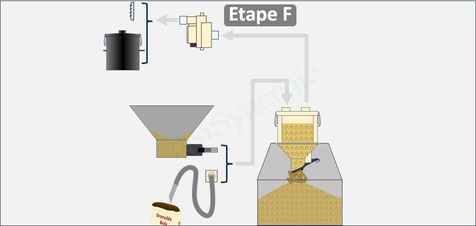 Le moteur d'apiration est en fonctionnement et le combustible (granulés ou pellets) est aspiré et tombe dans le doseur. La trappe du doseur est fermée et le combustible s'accumule dans le réservoir du doseur.