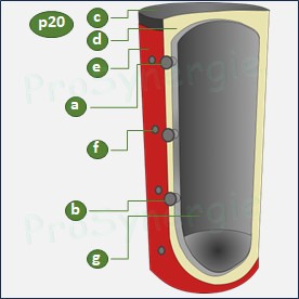 a : Alimentation décharge supérieure b : Alimentation décharge inférieure c : Capuchon ou protection supérieure d : Isolant (en général de la mousse polyuréthane) e : Jaquette de protection et finition f : Piquage pour installation de thermomètres avec doigt de gant, par ex g : Cuve en acier |