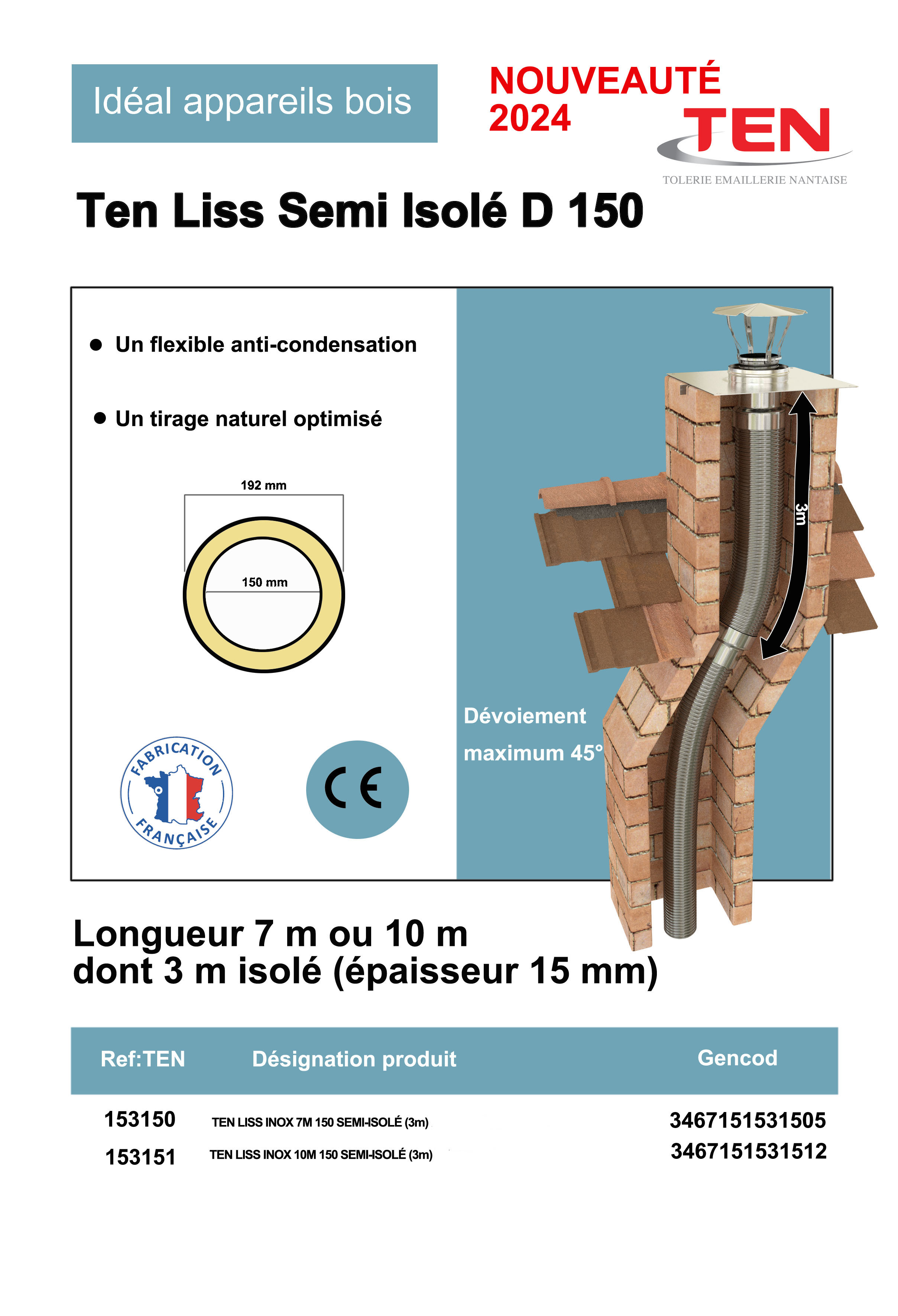 Tubage Ø150mm TEN Liss Semi-isolé (isolé sur 3 mètres) - Double Peau Inox 316L Intérieur/Extérieur